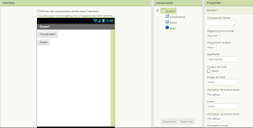 Ajoutez aussi un bouton pour le retour sur l'écran d'accueil, une "zone de texte" avec les propriétés Height et Width en "remplir parent", et "Nuance" en "Attente résultat", c'est là que l'on affichera le retour de la requête, dans un premier temps.