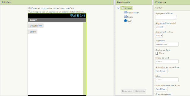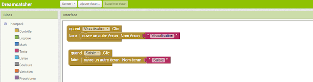 Sur l'écran Screen1, créez deux boutons pour accéder aux écrans que l'on vient de créer, et affectez leur le code pour ouvrir les écrans respectifs.