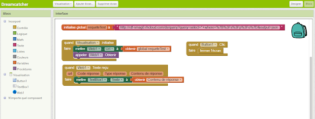 Dans le mode "Blocs", Ajouter une variable , nommez-la "requeteTest" et donnez-lui la valeur : http://rdf-smag0.rhcloud.com/ds/query?query=select+*+where+%7B%3Fs%3Fp%3Fo%7D&output=json