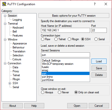 Comme avec WinSCP, on va devoir configurer putty :- Host Name : 192.168.240.1