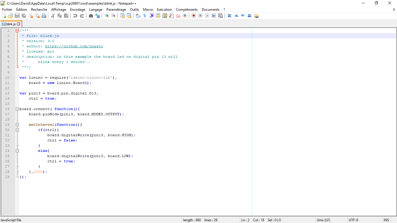 Pour ce faire, retournez dans WinSCP et double-cliquez sur le fichier "blink.js", si WinSCP est bien configuré (éditeur dans préférences), Notepad++ devrait s'ouvrir avec le code du script blink.js