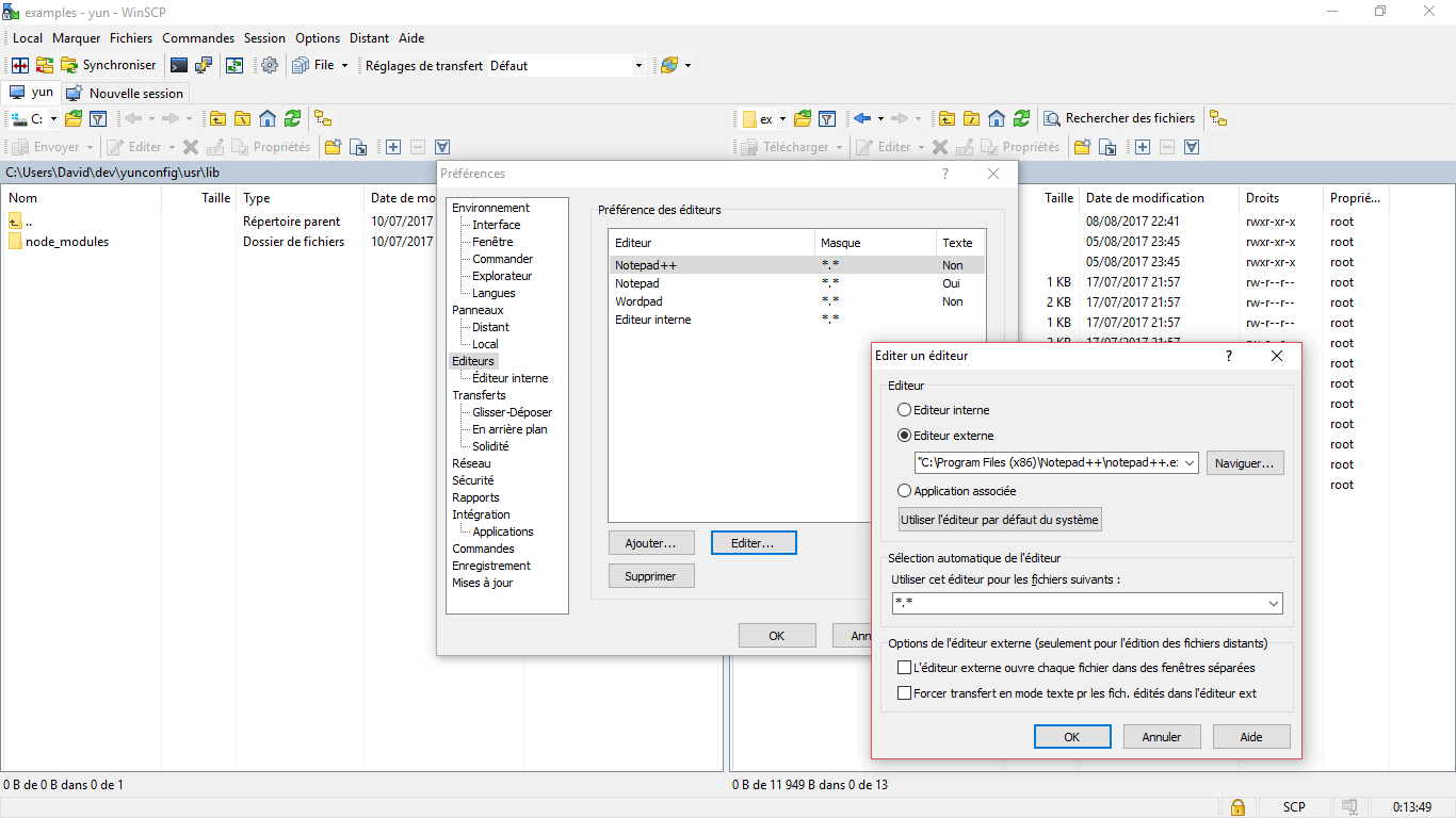 Afin de faciliter l'édition des fichiers à partir de WinSCP, il convient maintenant de modifier ses préférences, et de lui dire quel éditeur de texte utiliser. Nous avons choisi ici Notepad++, qui remplit grandement notre besoin pour cette tâche .